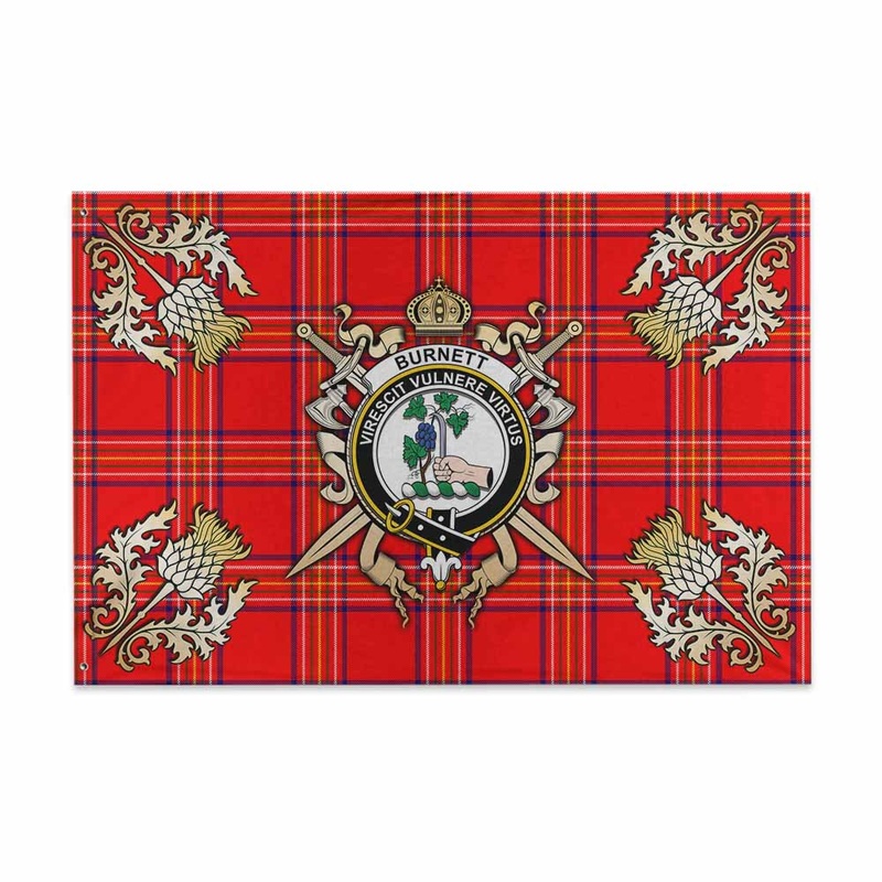 Burnett Tartan House Flag with Family Crest and Golden Thistle Crossed Sword DesignEmbrace your Scottish heritage with the House Flag, a vibrant emblem of culture, tradition, and pride. Designed for those who cherish their ancestry, this flag speaks to eve
