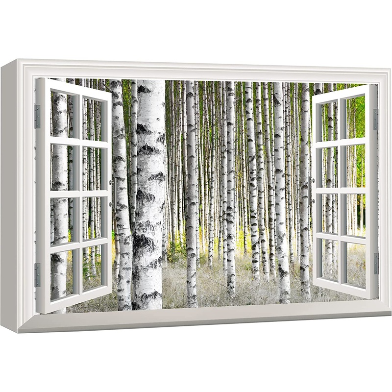 Canvas Print Wall Art Window View of White Birch Tree Forest Nature Wilderness Photography Realism Rustic Landscape Colorful Vibrant This high-quality canvas can be used to add color and life to any space. The canvas features state-of-the-art printing tech