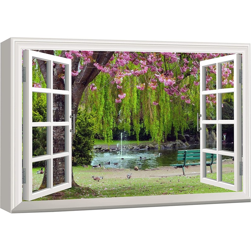 Canvas Print Wall Art Window View to Cherry Blossoms & Ducks in Park Nature Wilderness Photography Realism Rustic Landscape Colorful Multicolor Ultra This high-quality canvas can be used to add color and life to any space. The canvas features state-of-the-
