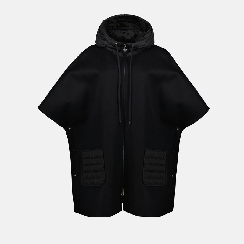 Cape capuche Moncler pour femme, collection Automne-Hiver 2024. Confectionne en laine et polyamide, elle prsente une capuche ajustable et des poches en nylon rembourres de duvet.