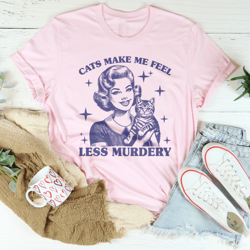 For the cat lover with a dark sense of humor, the “Cats Make Me Feel Less Murdery” T-shirt is a must-have! This playful tee celebrates the calming magic that only a purring kitty can bring, perfect for those days when the rest of the world is just a bit too much.