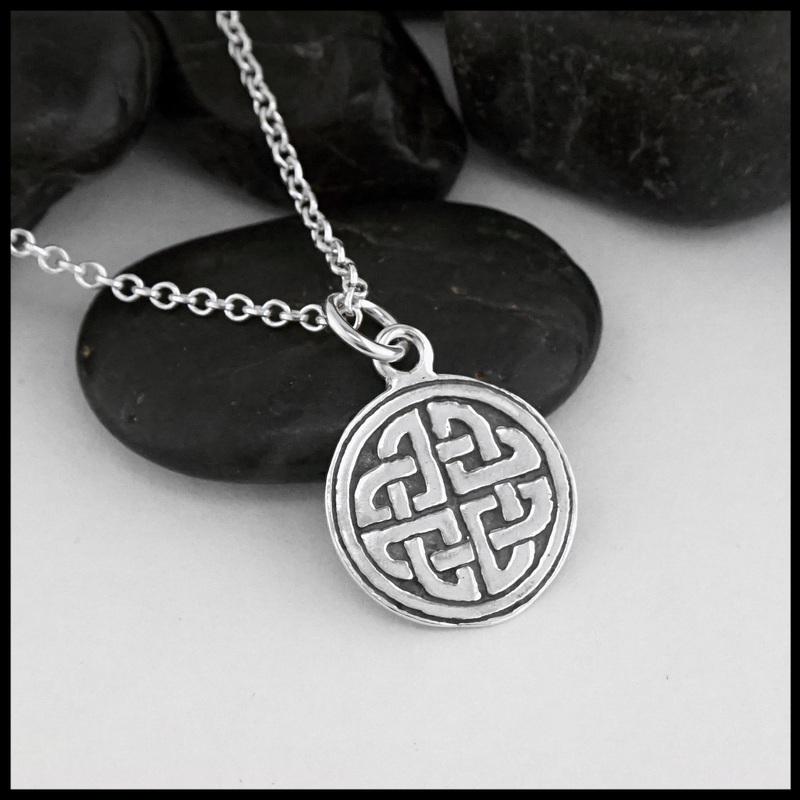 Sterling Silver small circle pendant with Celtic Knotwork details. This pendant comes with your choice of chain.