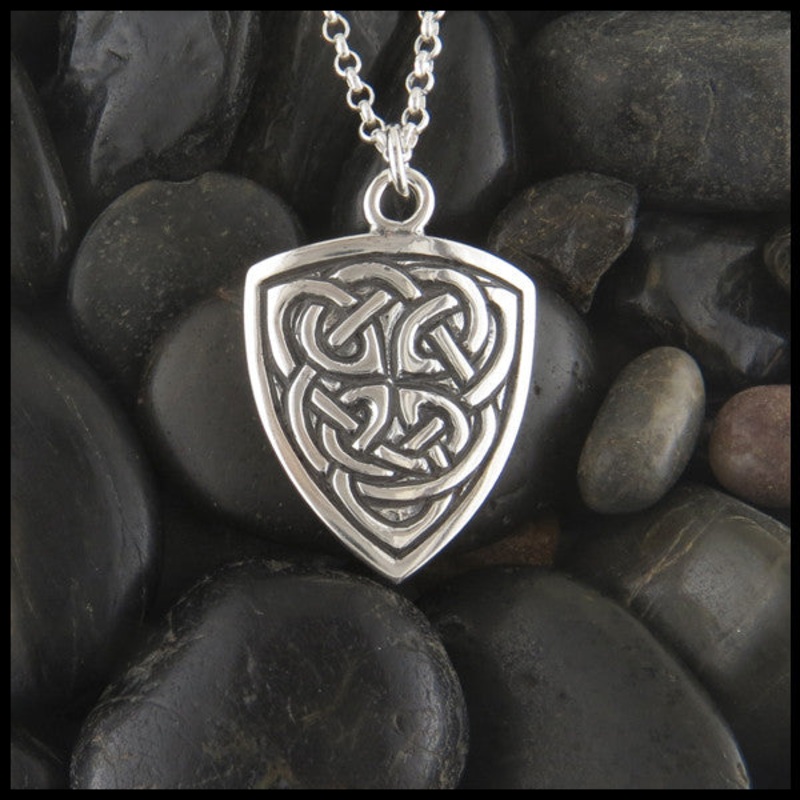 This Celtic Shield Pendant in Sterling Silver features intricate celtic knotwork that forms a continuous path across the pendant. The Shield pendant is available with your choice of chain or without a chain.Shown with a Medium Rolo Chain.Available as a Bol