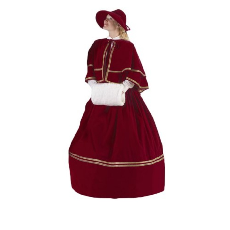 Includes: Velvet skirt with gold trim, reversible velvet cape (inside plaid taffeta), faux fur muff and matching velvet hat.4 pc ensemble.Size (Bust): S (34), M (36), L (39), Plus (14-22)Color: Green, Deep RedMade in USA /High-quality Velvet /Superior Qual