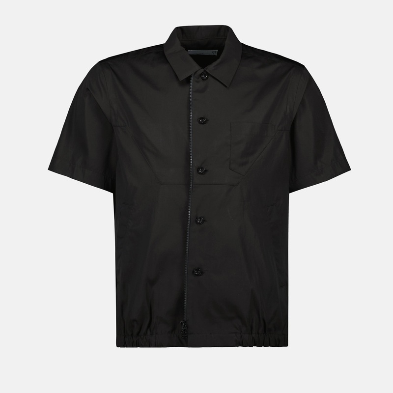 Chemise en coton noir de la marque Sacai pour homme, issue de la collection Printemps-t 2025. Ce modle prsente un col classique, des manches courtes et des poches latrales plaques.