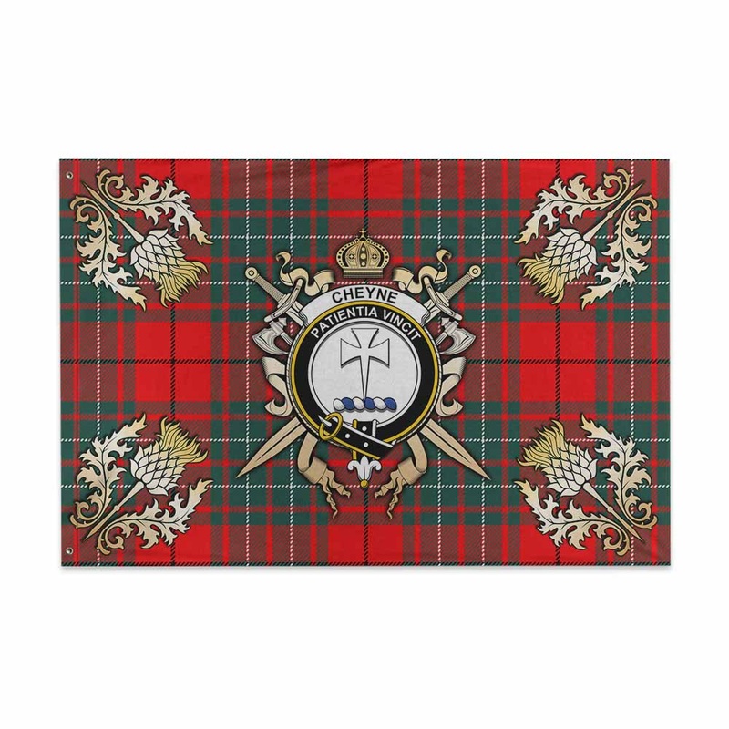 Cheyne Tartan House Flag with Family Crest and Golden Thistle Crossed Sword DesignEmbrace your Scottish heritage with the House Flag, a vibrant emblem of culture, tradition, and pride. Designed for those who cherish their ancestry, this flag speaks to ever