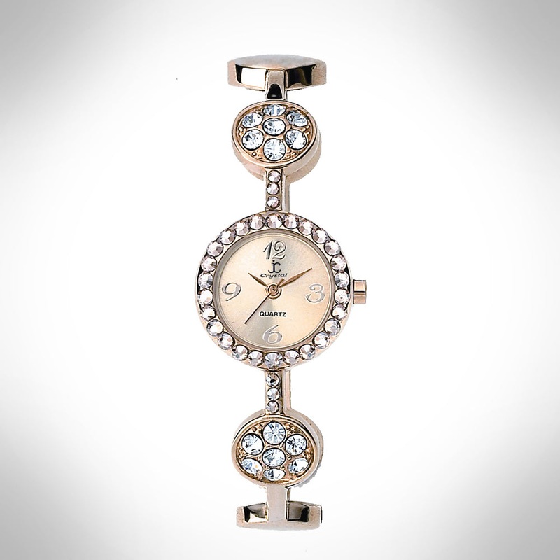 Elegant gold-tone, watch featuring sparkling crystals accents on both the bezel & bangle Embellished with crystals, which are set by Jimmy Crystal's expert craftsmanship. This product provides unparalleled aesthetics to transcend elegance. Logo at 12 o