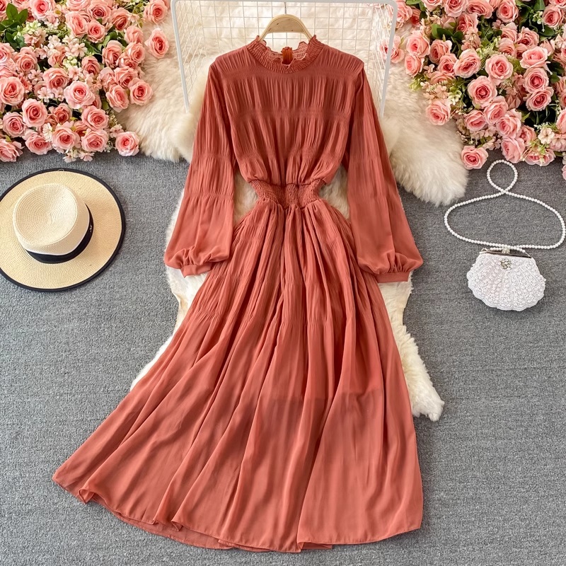 Chic Stand Collar Chiffon Dress Autumn Long Sleeves Long Skirt 1381