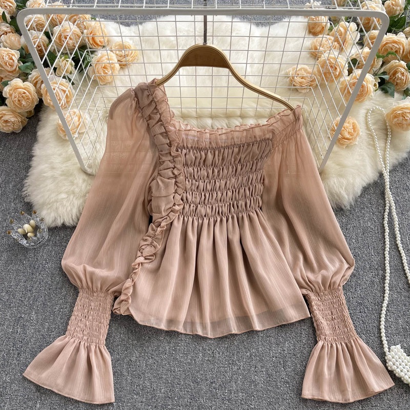 Chiffon Trumpet Sleeve Off shoulder Top Summer Women Pleated White Top 1052