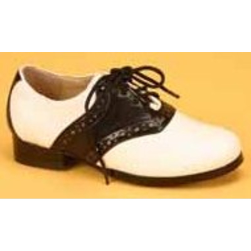 This shoe is made of a quality white imitation patent leather with black imitation stitched leather overlay saddle design, black shoe ties, soft imitation kid type leather inside lining, and soft padded foot rest.This is a great reproduction of an old classic.Perfect finishing touch for that poodle outfit or any 1950’s costume ensemble.