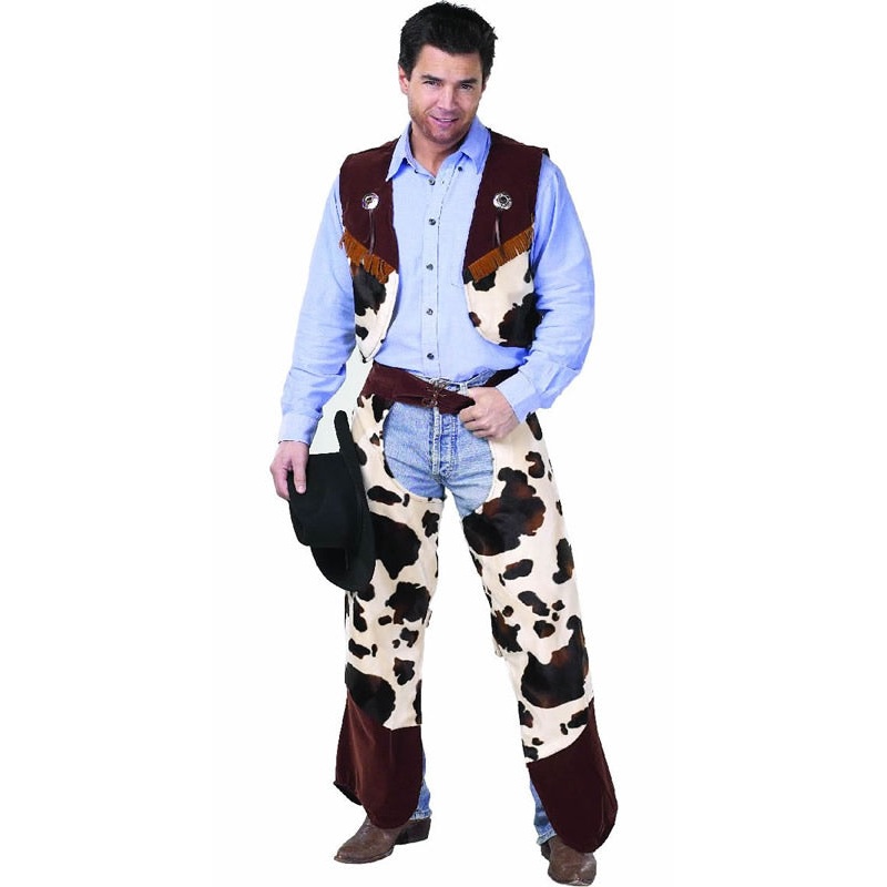 Includes: Plush vest with contrasting yoke, faux suede fringe detail, medallions, coordinating Cowprint chaps with lace up waist and velcro, closure leg straps (for better fit).Color: Brown/Ivory/Black (shown)Size: L (40-42)CS80114 L