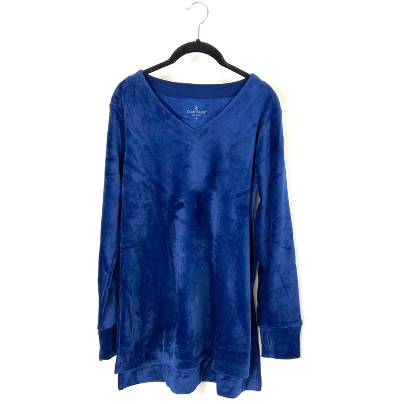 Cuddl Duds velour like, soft and cozy, blue top withlong sleeves with thumb holes, v-neckline, and slight side slits