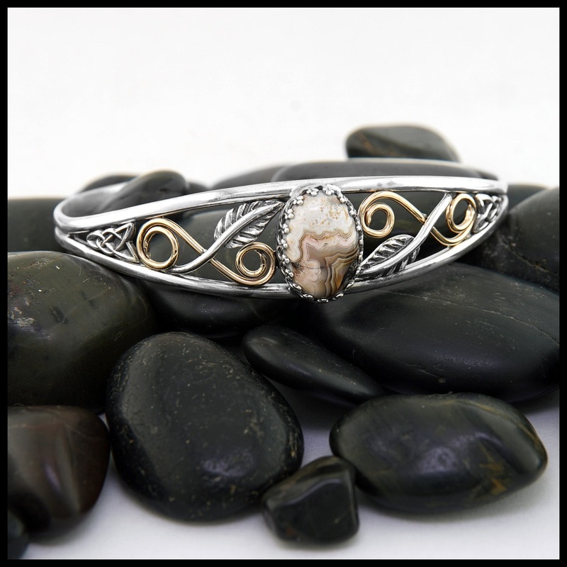 Unique Cuff Bracelet made with a sterling silver frame, setting, leaf an vines, and celtic knotwork accented with Rose Gold filled spirals. The center set stone is a Crazy Lace Agate. This bracelets fit a 7 inch wrist.Original designs Stephen WalkerPlease