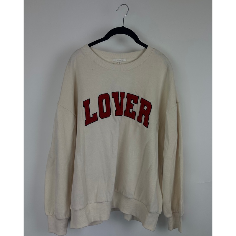Z Supply cream colored crewneck sweatshirt with red “Lover” lettering and fleece lining.