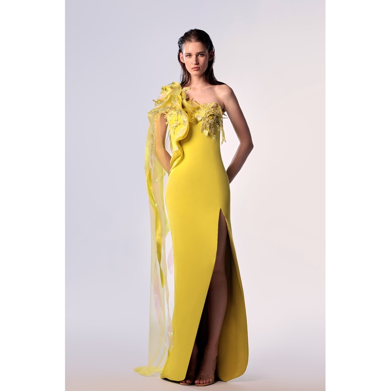 Yellow one-shoulder crepe straight-cut dress. Featuring an asymmetric neckline adorned with mousseline and lace embellishments. Complemented with one tulle cape sleeve with holographic draping. Completed with a straight-cut skirt and a side slit.