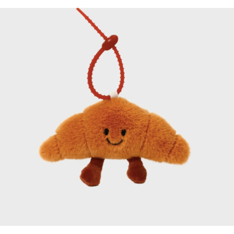 This Croissant Charm is an adorable plush accessory featuring a cute smiling face and tiny legs, making it a fun and whimsical addition to any bag or keychain. Perfect for food lovers and those who enjoy playful designs!
