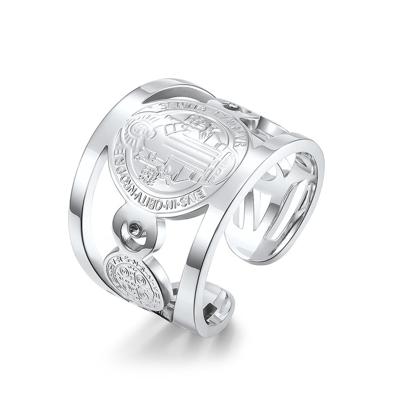 Introducing the Cross-border European and American style Saint Benedict Exorcist stainless steel ring a unique blend of fashion and spirituality designed for the modern man. Crafted from high-quality titanium steel, this ring not only boasts a stunning aes