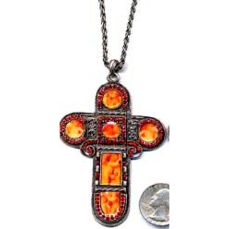 All Metal w/Assorted Color Gems Going AroundPart of the Cross. Pictures are Sepia StyleReligious Looking Angles.