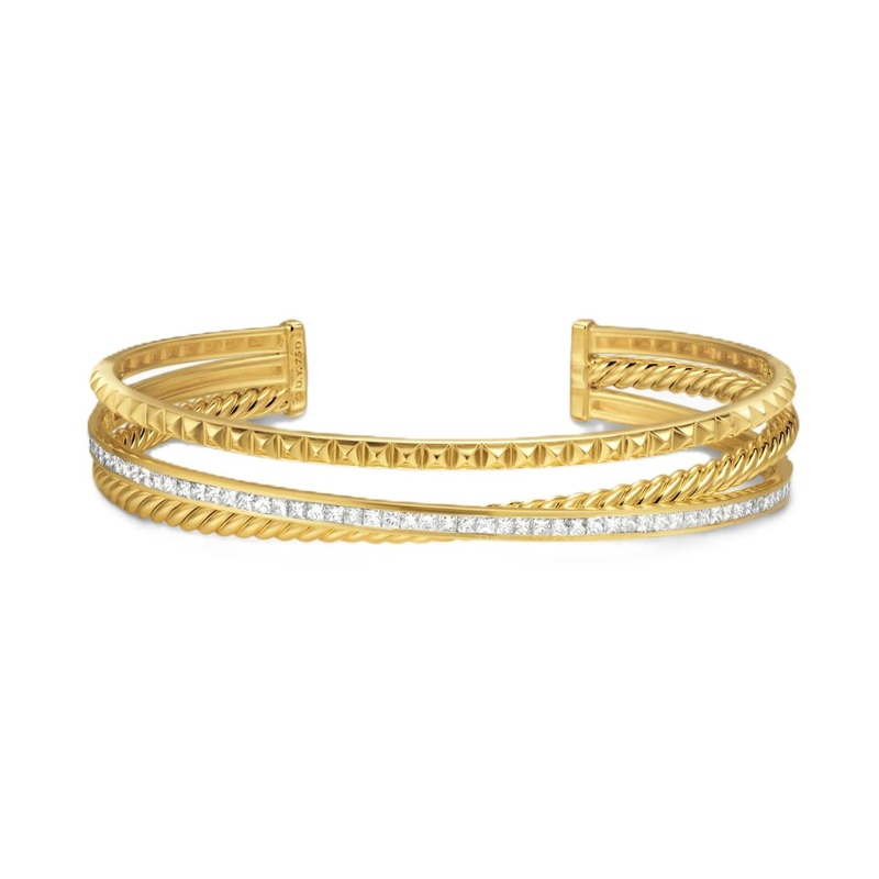 Crossover Trio Three Row Cuff Bracelet 18K Yellow Gold with Diamonds, 11mm