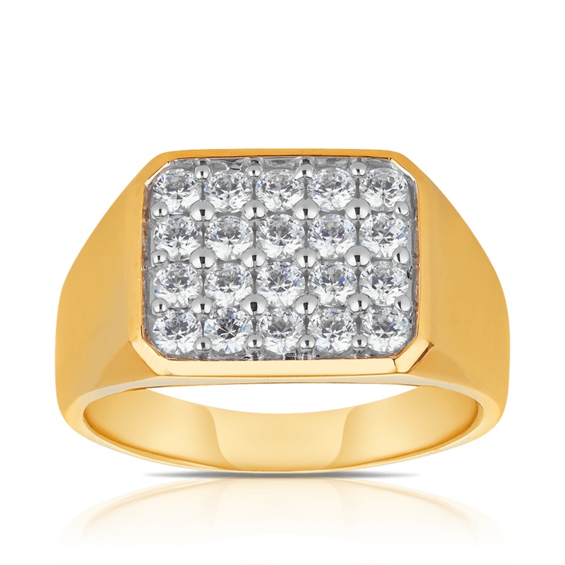 Introducing the perfect accessory for the modern man: The Cubic Zirconia Men's Signet Ring in 9ct Yellow Gold. This luxurious ring features 20 cubic zirconia gems crafted into a polished finish, each with a dimension of 2.5mm, claw set together to create a