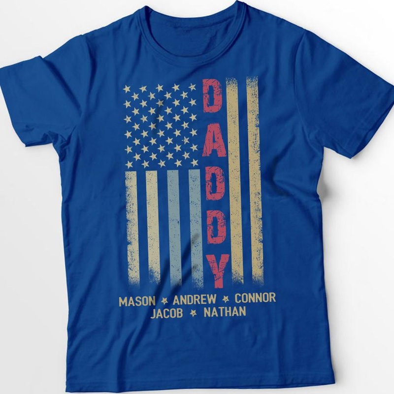 Custom Flag Daddy with Grandkids Independence day T ShirtGreat as Birthday gifts or Holiday presents. This adorable item can be designed upon anyone's wish with any title.Please enter:1. Nickname: Papa, Grandpa, Pawpaw, Pop-Pop, Papaw ...etc.2. Kids' Names