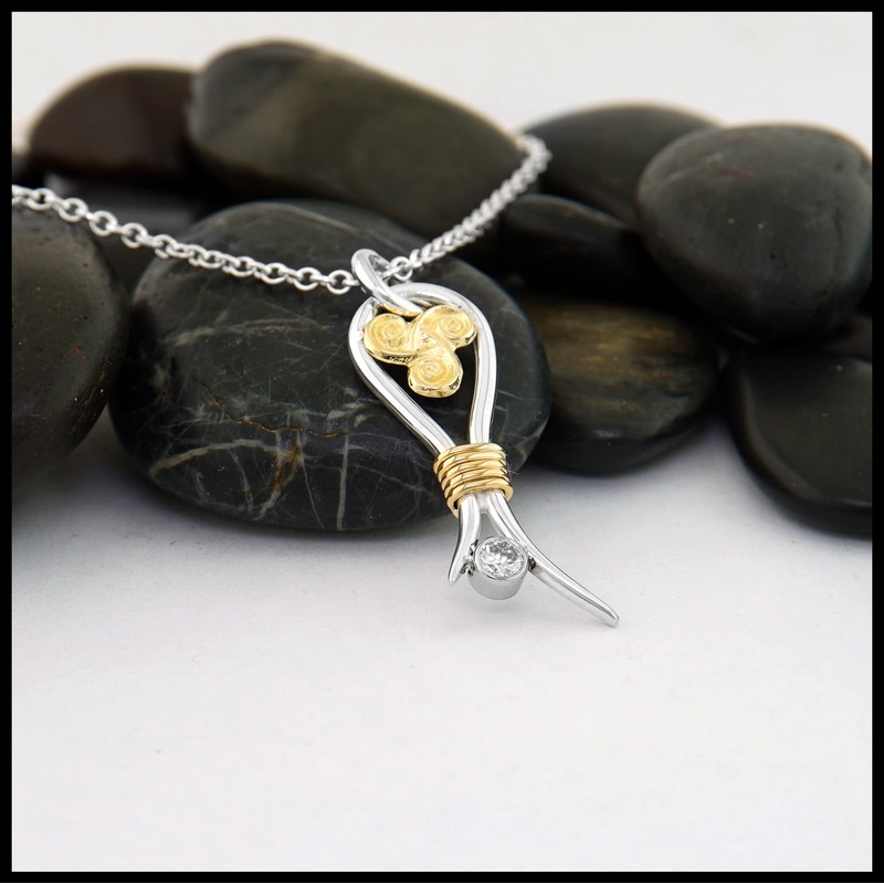 This custom pendant features a sterling silver frame with a 3mm bezel set diamond. The frame is decorated with an 18Kyellow gold triskele and wire wrap. This pendant comes with an 18" cable chain.Original designs Stephen WalkerPlease call or email for more