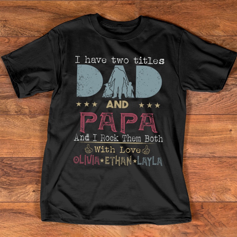 Dad and Papa with GrandkidsGreat as Birthday gifts or Holiday presents. This adorable item can be designed upon anyone's wish with any title.Please enter:1. Nickname: Papa, Grandpa, Pawpaw, Pop-Pop, Papaw ...etc.2. Kids' Names wanted on the shirt (Names se