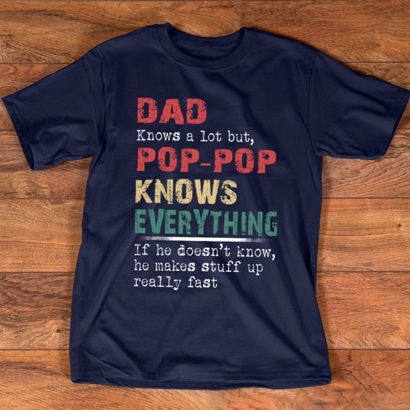 Dad Knows a lot but, Pop Pop Knows everythingGreat as Birthday gifts or Holiday presents. This adorable item can be designed upon anyone's wish with any title.Please enter:1. Nickname: Papa, Grandpa, Pawpaw, Pop-Pop, Papaw ...etc.2. Kids' Names wanted on t