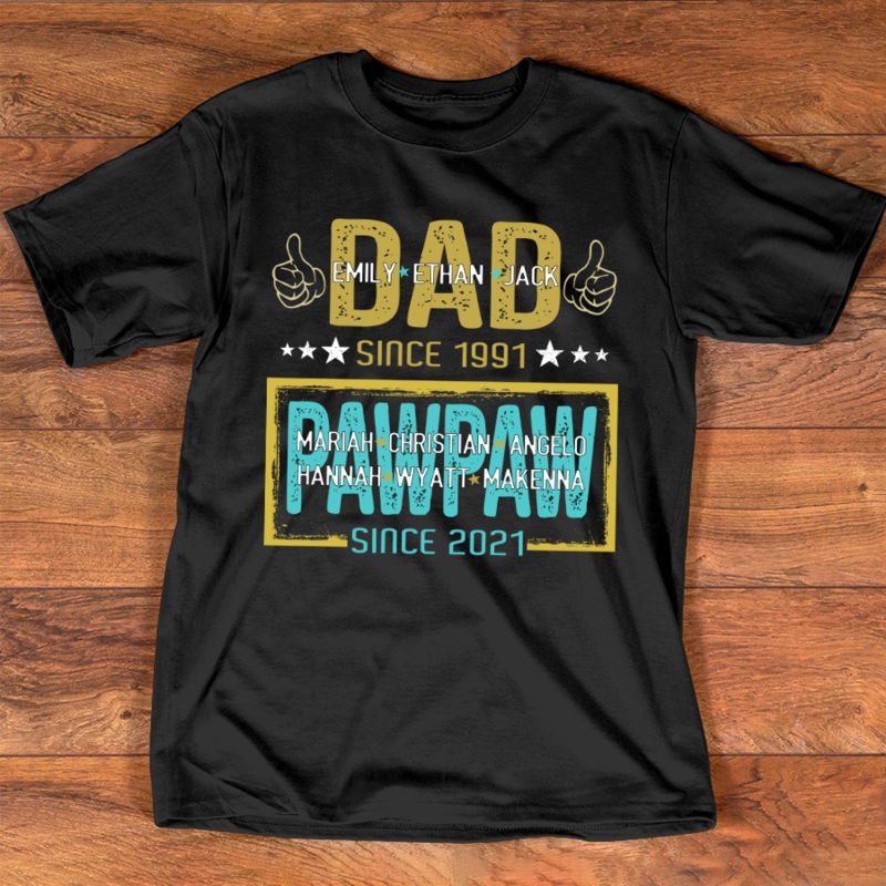 Dad Since Kids PAWPAW Since GrandkidsGreat as Birthday gifts or Holiday presents. This adorable item can be designed upon anyone's wish with any title.Please enter:1. Nickname: Papa, Grandpa, Pawpaw, Pop-Pop, Papaw ...etc.2. Kids' Names wanted on the shirt