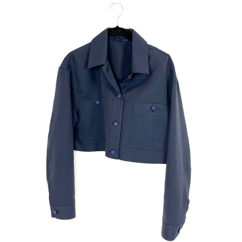 Dark blue cropped button down top, with buttoned pockets, collar neckline, with button cuff sleeves