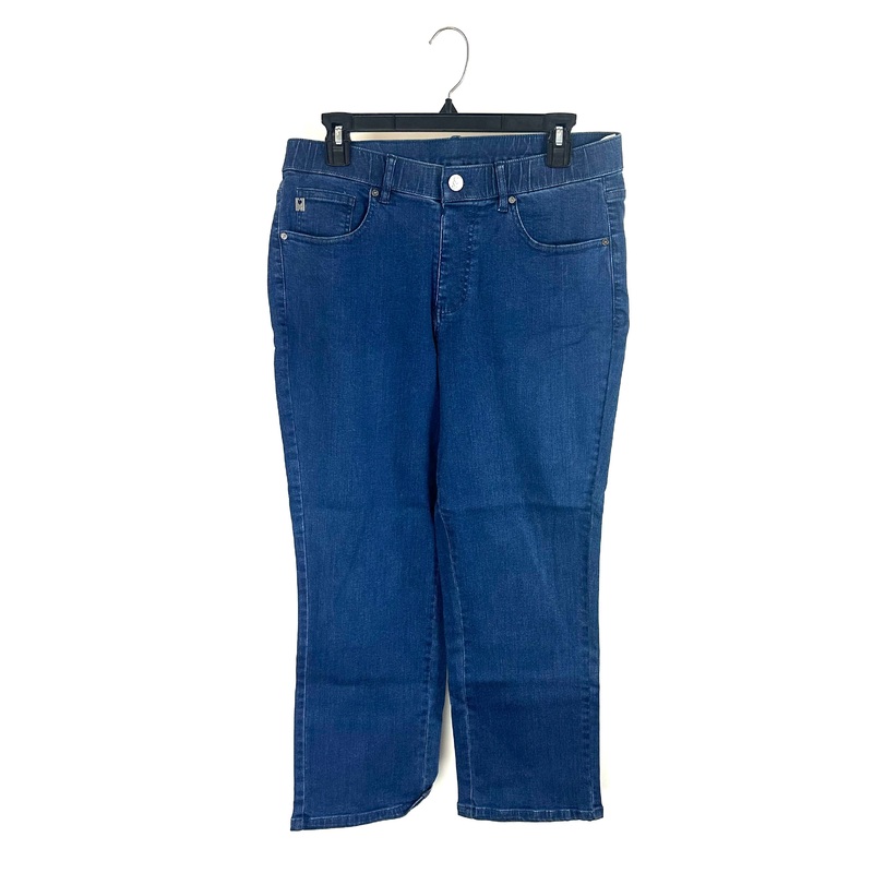 Brand new - donated from the designerBelle by Kim Gravel dark wash jeans with elastic waistband, front button closure, belt loops, and front slash and back pocketsWomens Size 1266% Cotton, 31% Modal & 3% SpandexEstimated Original Retail Price: $74*This is