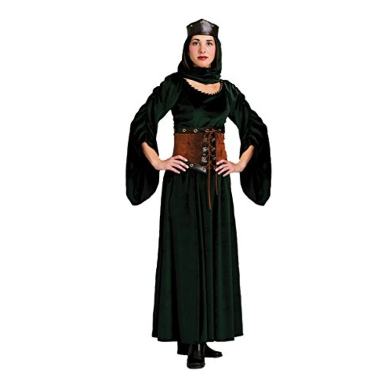 Includes Dress accented with cable rope piping, lace-up corset belt with eyelets, matching cowl and crown.Color: Green w/brown corsetSizes (Bust): S (34), M (36), L (39)Made in USAMEASURE BEFORE YOU ORDER. Many costumes are NON-RETURNABLE.All returns subje
