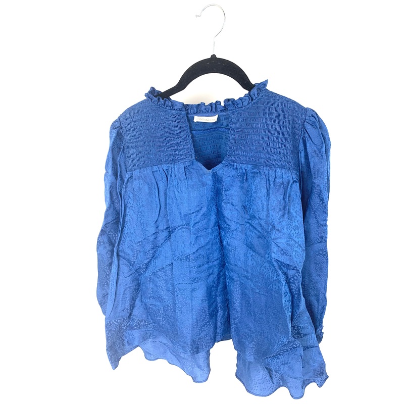 Brand new - donated from the designerShoshanna leaf-printed, denim-like blouse with the top of the bodice being smocked with three claps that creates a high rounded neckline with a ruffled trim or it can be opened for a v-neckline, and long balloon sleeves