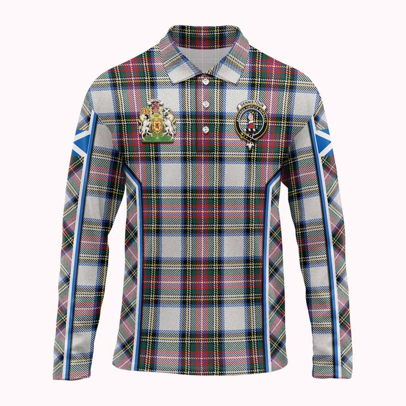 Dennistoun Tartan Crest Long Sleeve Polo Shirt Scotland Coat of Arm Flag Style