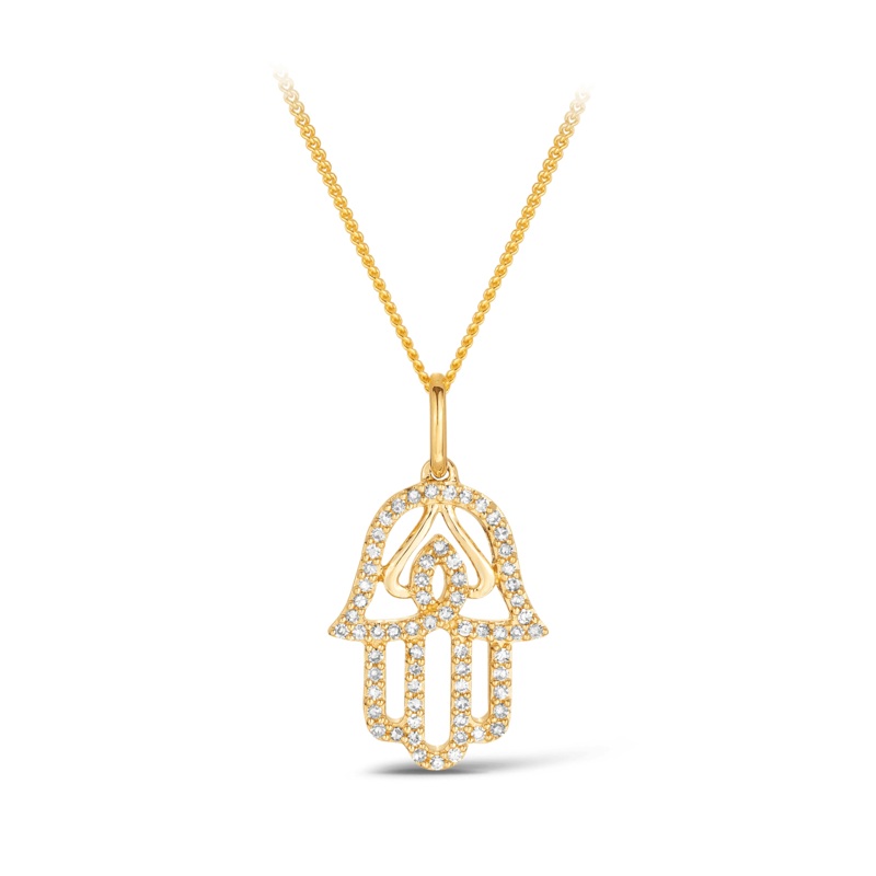 The Hamasa hand is a popular amulet throughout the Middle East and North Africa. This amulet is believed to protect the wearer from danger. The pendant has a total diamond weight of 0.153.