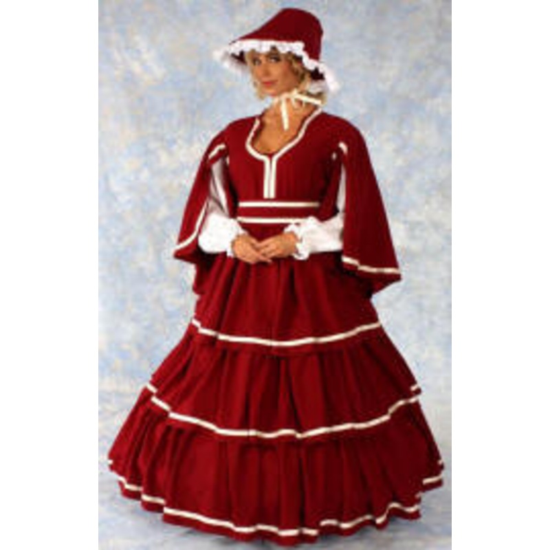Includes: 4 piece authentic styled rich burgundy linen styled fabric w/a three tiered full circle skirt, blouse, sash & bonnet.