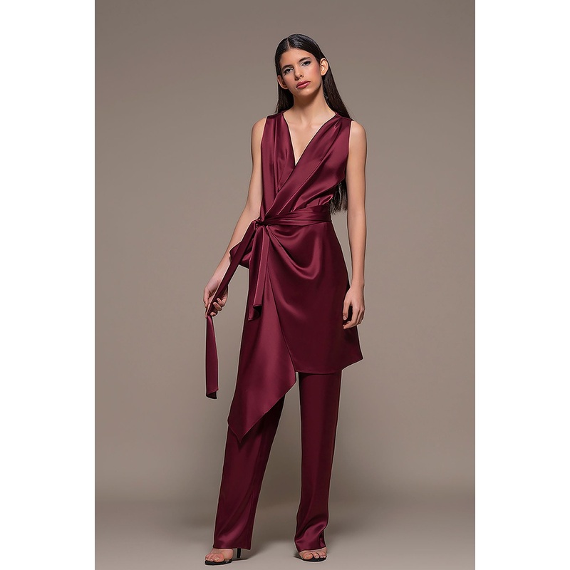Burgundy ensemble. Featuring a sleeveless draped long envelope top with a V neckline, and a banded belt. Complemented with long straight cut pants.