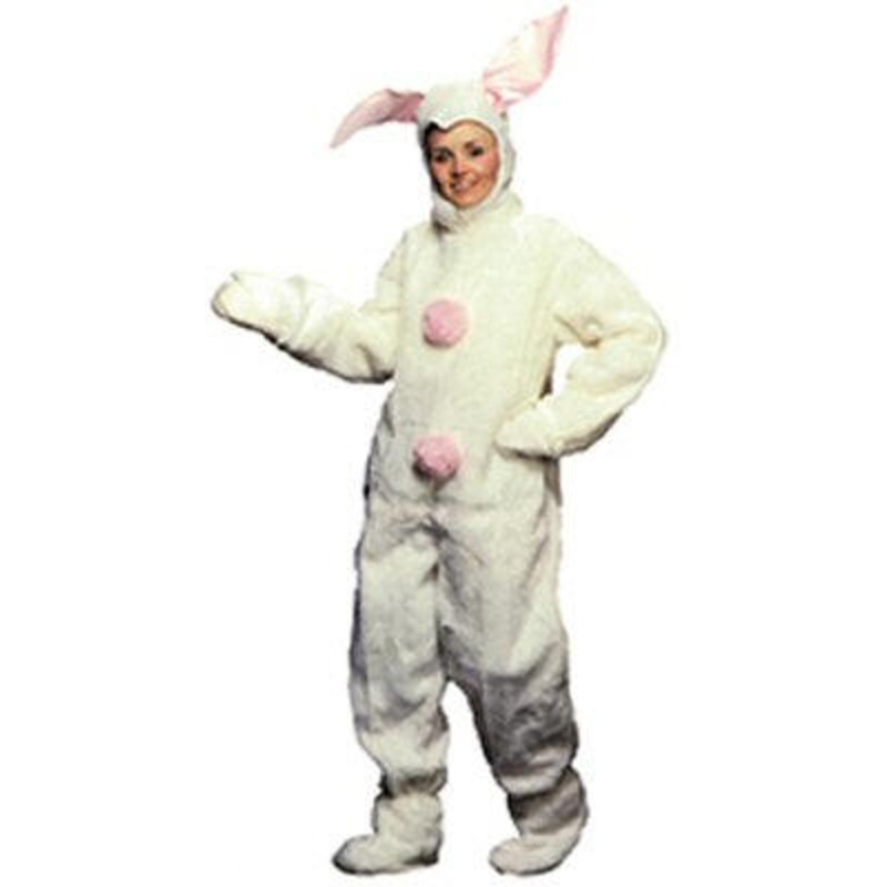 Includes: White acrylic pile plush fur jumpsuit w/zippered back, pink acrylic pile plush tummy (H1091 shown with 2 pink pom poms on belly), pink pom-pom cotton tail, open face fur hood/head w/velco closure under chin, fur shoe covers & mittens.Color: White