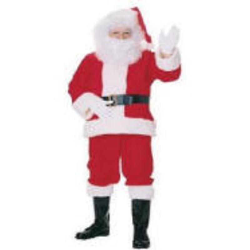 Includes: Red Duvetyne Pullover coat accented w/white long-hair trim, matching pants w/side pockets, hat w/large pom-pom, bound belt (w/gilt buckle w/prong & loop), vinyl boot tops w/matching cuffs, Beard & mustache set.Size: L (Chest 42-48) (Waist Up to 5