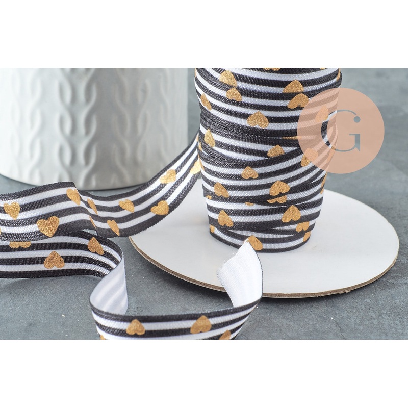 EFJF gold hearts striped elastic ribbon, EVJF bracelet, wedding ribbon, scrapbooking, 16mm, x1 meter (G1583)