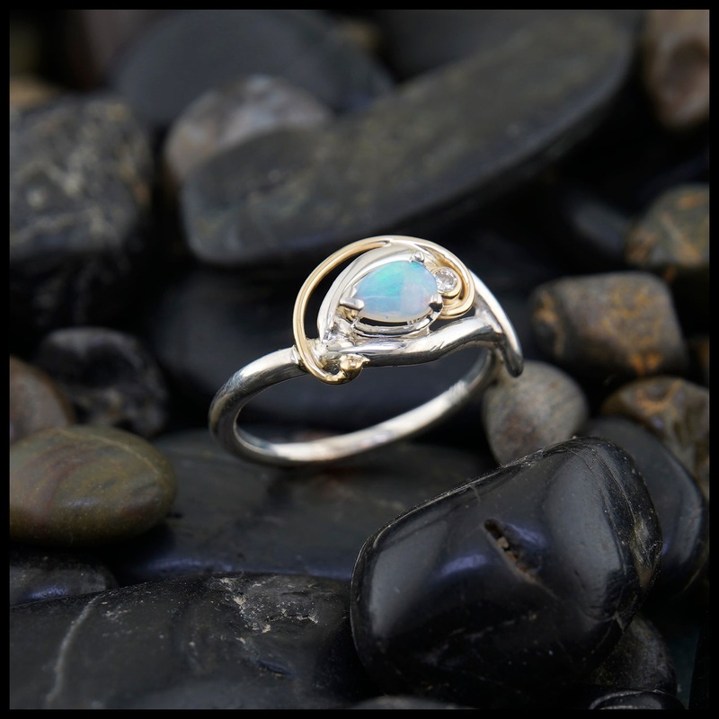 This ring showcases a pear shaped opal set in a custom sterling silver band. The band is decorated with a diamond bezel set in 14K yellow gold along with wire detailing. This ring is a size 7 1/4 and can be resized upon request.Original design Tom CarterPl