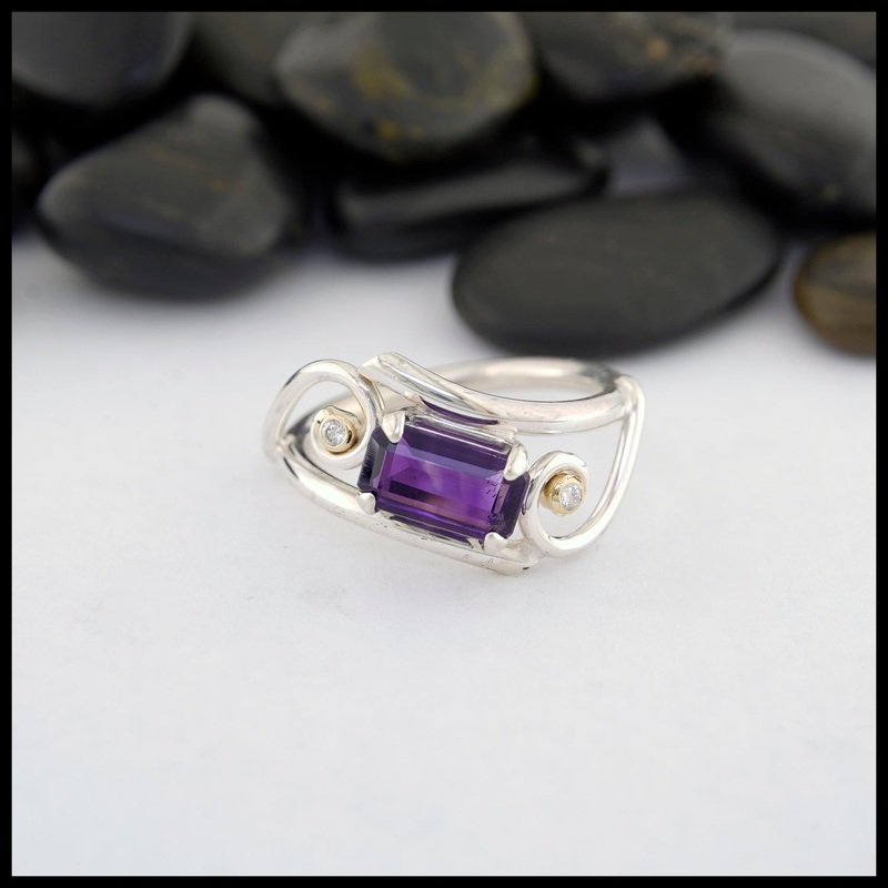 This elegant ring showcase an elongated emerald cut amethyst centerpiece in a custom sterling silver band accented with 2 bezel set diamonds in 14K yellow gold. This ring is a size 7 1/2 and can be resized upon request.Original design Tom CarterPlease call