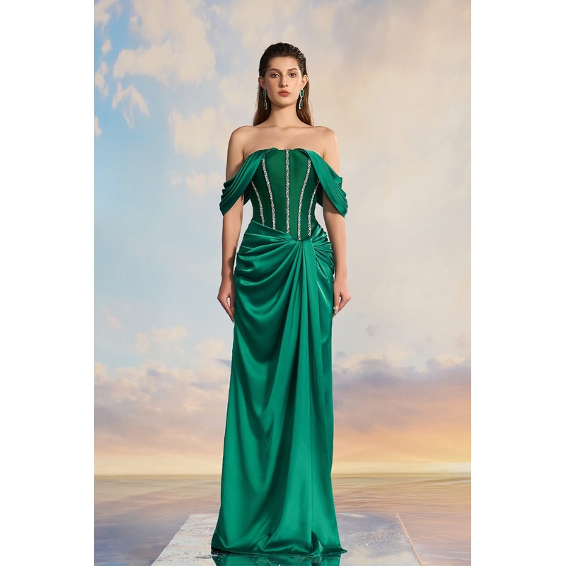 Emerald green taffeta dress features an off-shoulder neckline with draped sleeves, a fitted bodice with vertical crystal accents, a gathered waist with side draping, and a flowing skirt.