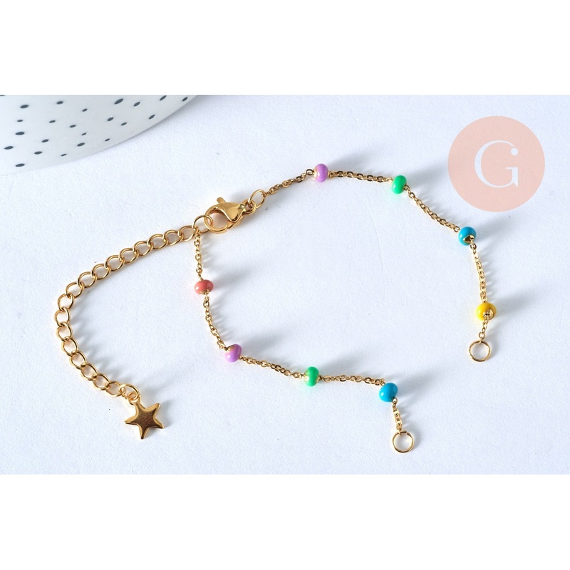 A feminine bracelet base in 14k gold-plated steel, made of fine curb chain and colored resin beads, all in gold-plated stainless steel, finished with a lobster clasp. Halfway through, it is equipped with two open rings to insert a connector of your choice.
