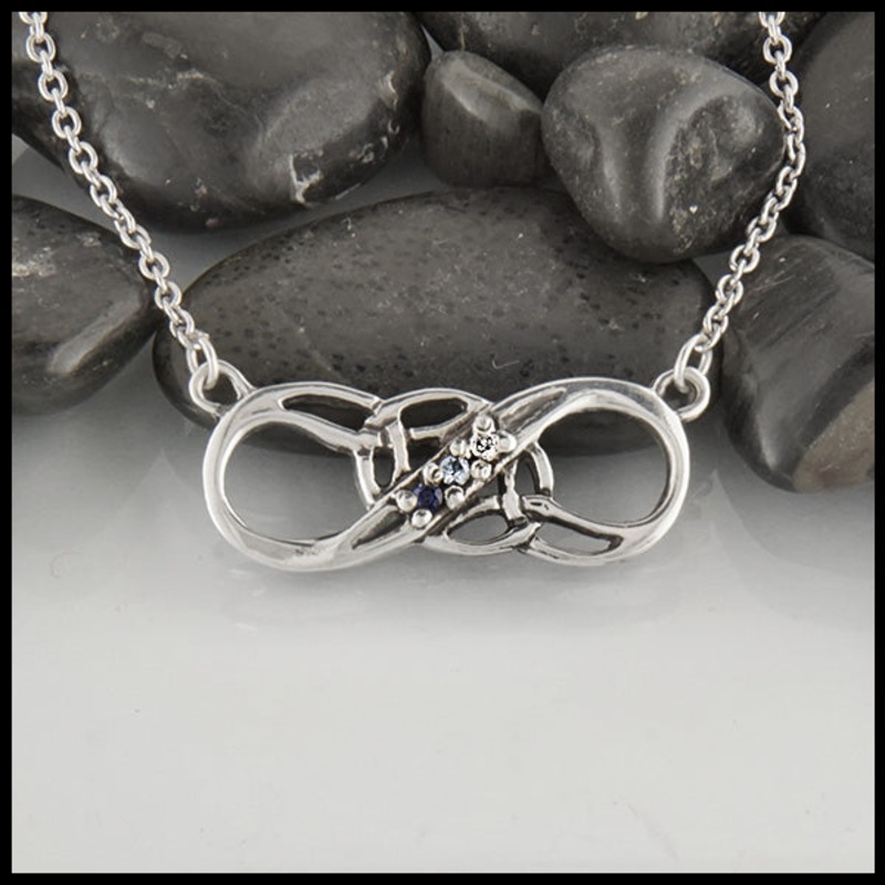 Our Sterling Silver Eternity Mother's Necklace is an infinity knot with two accent trinity knots, and can be set with up to seven birthstones. Comes with attached 16" cable chain.is a craftsman run workshop specializing in authentic Celtic jewelry and mixe