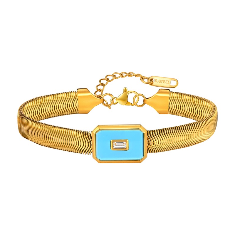 Discover the elegance of the European and American jewelry stainless steel flat snake chain zircon light blue black shell square bracelet golden lady. This exquisite piece merges contemporary design with timeless sophistication, making it a must-have acces