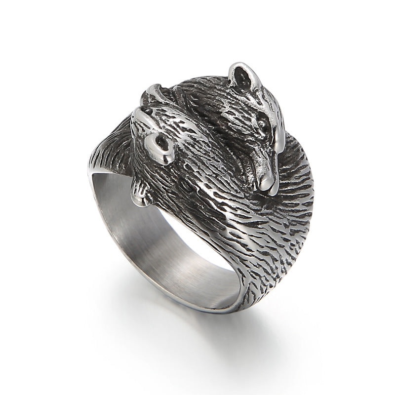 European and American Retro Double Wolf Head Men’s Titanium Steel Ring – Fashionable and Dominant Design