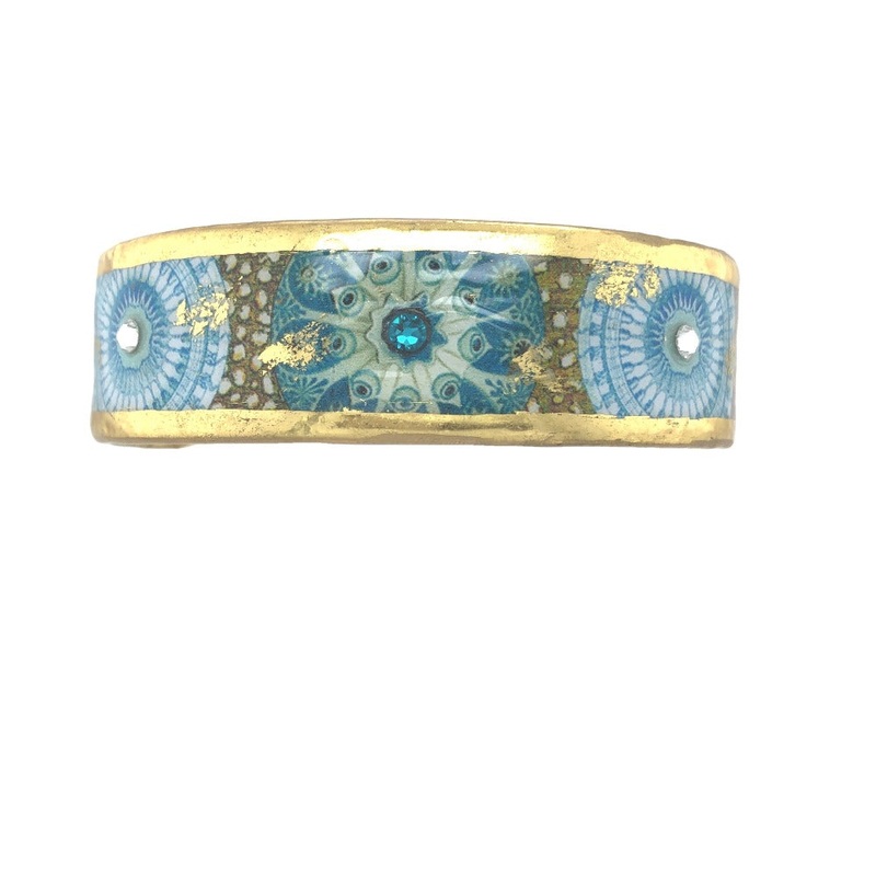 Thisbeautifully designed Jellies Cuff by Evocateurreminds usof the seain shades of gold,blue, andgreen, accented with Swarovski crystals.22 carat gold leaf.75" width2.5 diameterSize Medium - Fits 6to 6.75inchwristThis item is available in store and online.