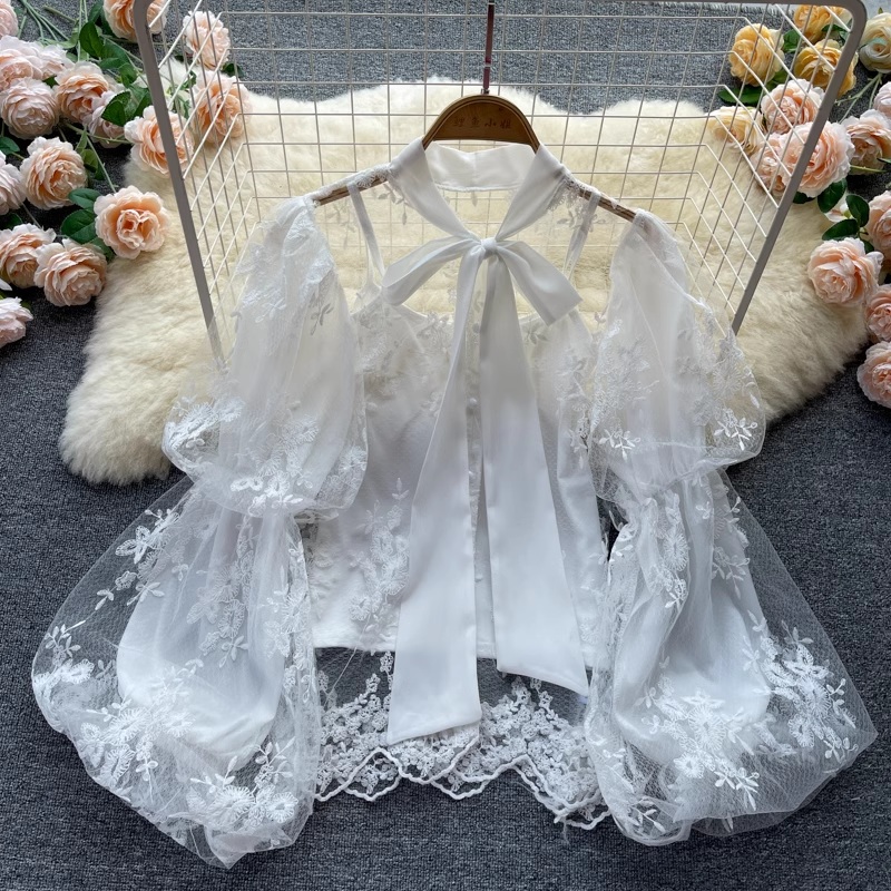 Fairy Bow Tie Puff Sleeve Lace Chiffon Shirt Mesh Embroidery Hollow Top 1038