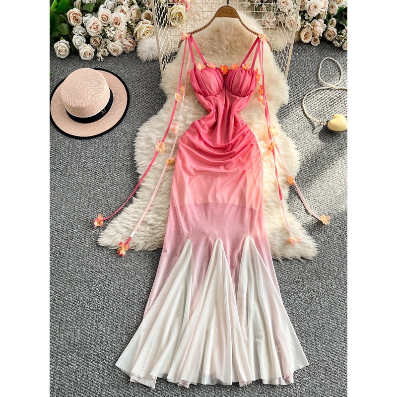 Fairy Gradient Color 3d Flower Dress Summer Slim Mermaid Long Skirt L66